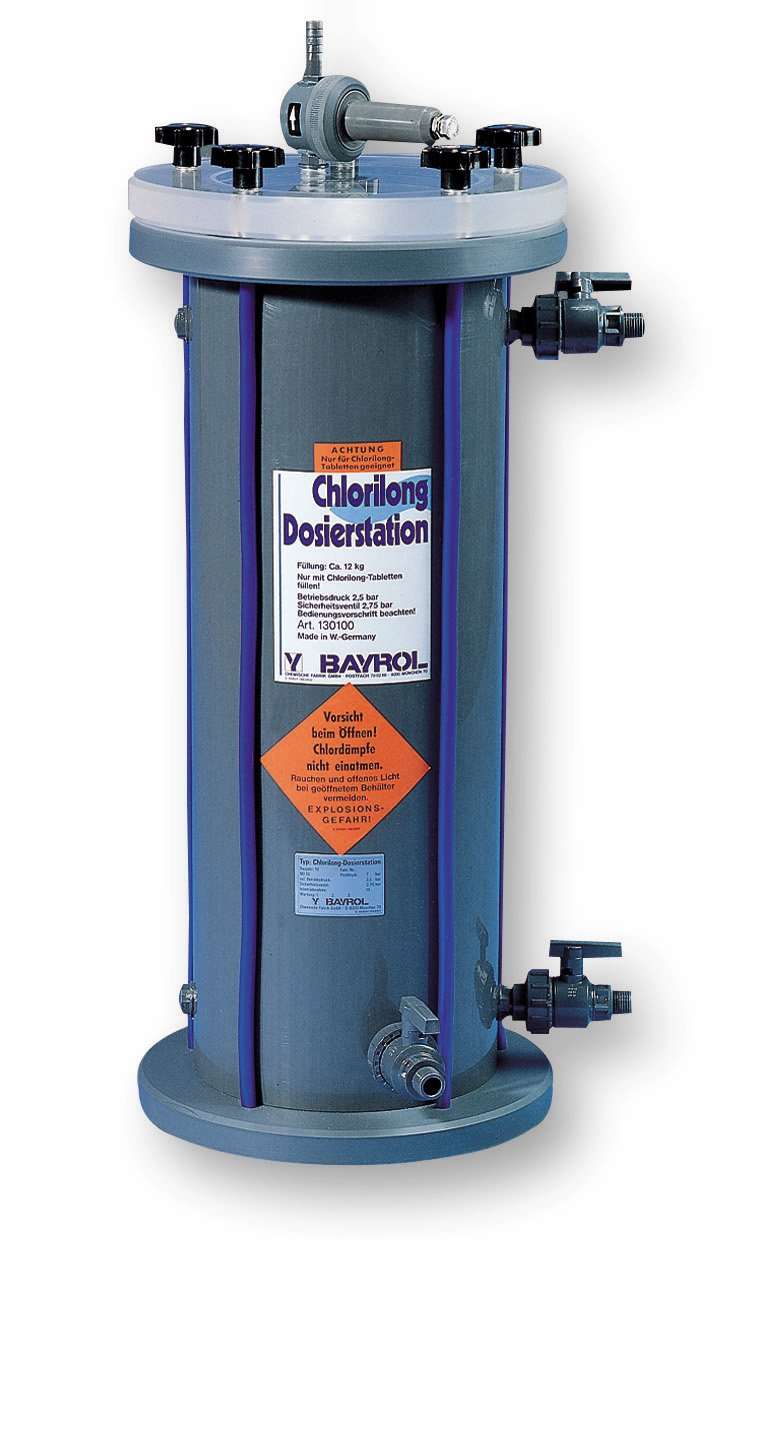 Estación dosificadora por erosión mecánica para una cloración continua con las tabletas de cloro estabilizado de disolución lenta. Para piscinas con un volumen superior a 100 m³.