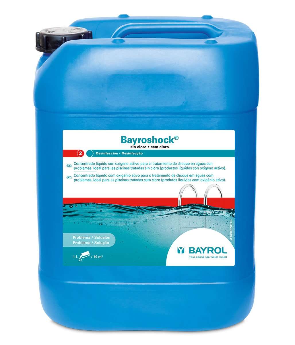Bayoroshock es un líquido muy concentrado a base de oxígeno activo para un tratamiento de choque sin cloro en caso de problemas con el agua. Ideal para piscinas tratadas con oxígeno activo.